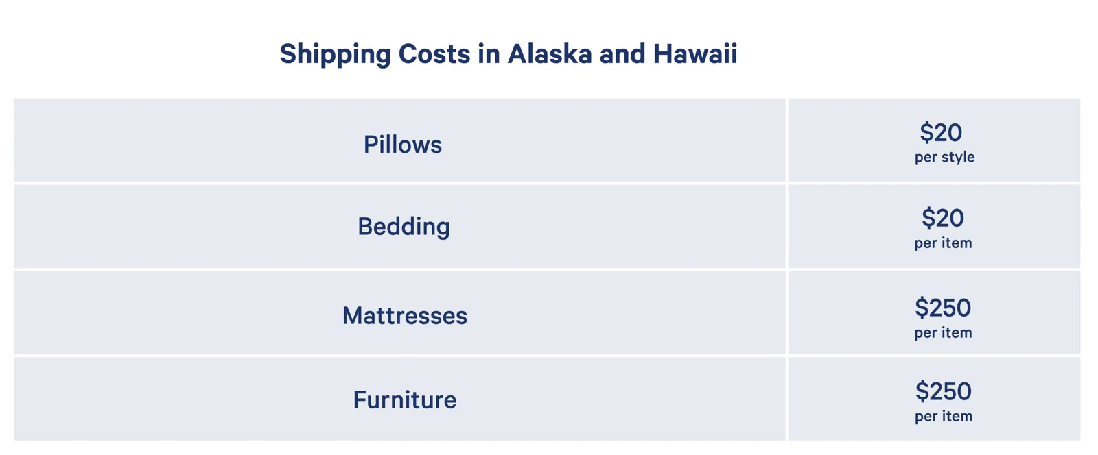 Shipping via UPS is free for mattresses, soft goods, and accessories within the contiguous United States. We are unable to ship to APO and PO Boxes, or US Territories like Puerto Rico and the Virgin Islands.